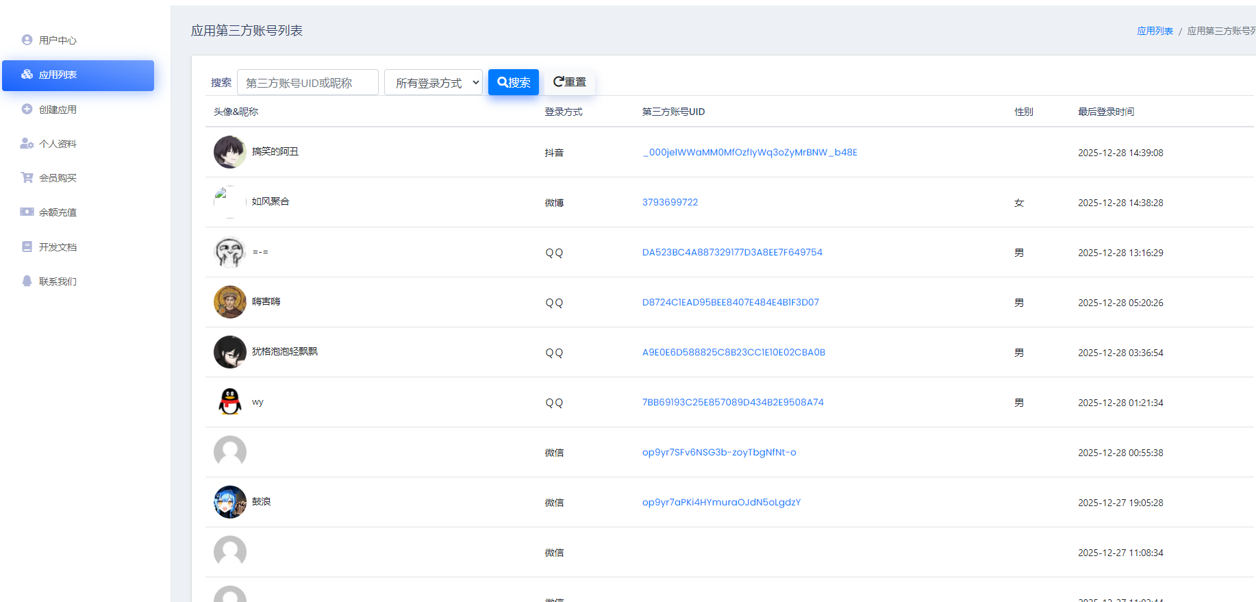 这里的第三方平台,是指QQ、微信、微博、百度等平台。通过本站的聚合登录接口,你的网站可以登录获取相应的用户信息和授权信息,例如uid、token、用户昵称、头像等。