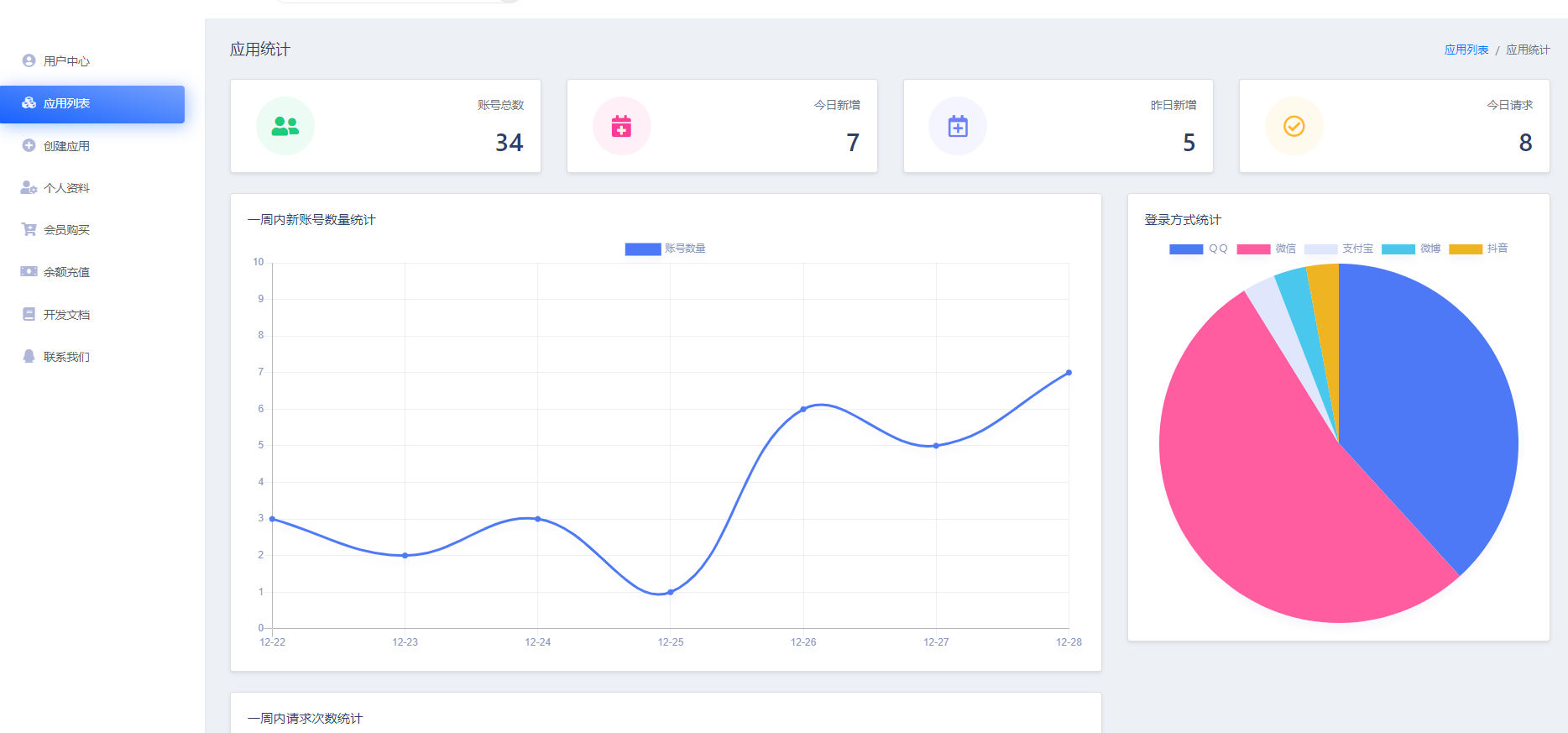 2、更方便查看应用统计,包括不同登录方式占比、新账号数量、请求次数等统计信息